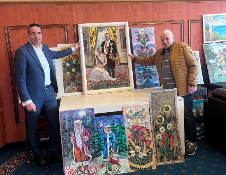 Voor het bezoek hadden bewoners een tafel vol heerlijke Oekraïense gerechten bereid, die zij graag met het college en elkaar deelden. Een bijzonder moment was de ontmoeting met een van de bewoners, Mykola Zhaivoronok, een kunstschilder. Hij overhandigde het college een zelfgemaakt schilderij van koning Willem-Alexander en koningin Máxima. Het kunstwerk krijgt een plek in de wisselcollectie van het gemeentehuis, samen met andere schilderijen van Mykola Zhaivoronok.